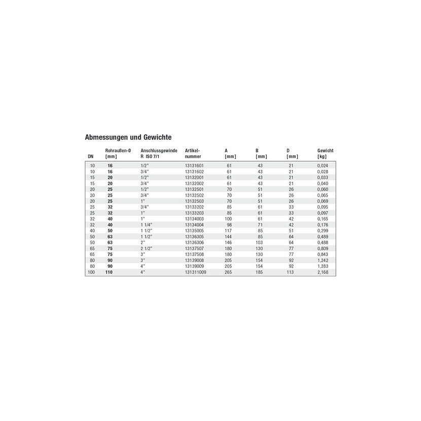 Materiály: - Těleso: Kopolymer (PP-B), odolný proti UV záření - Stahovací kroužek: Polypropylen - Kuželová matice: Polypropylen, odolný proti UV záření - Svěrací kroužek: Polyacetal Resin (POM) - O-kroužek: NBR pro různé druhy použití - Zesilovací kroužek: Ušlechtilá ocel, AISI 430, pro vnitřní závit 1 1/4" – 4"