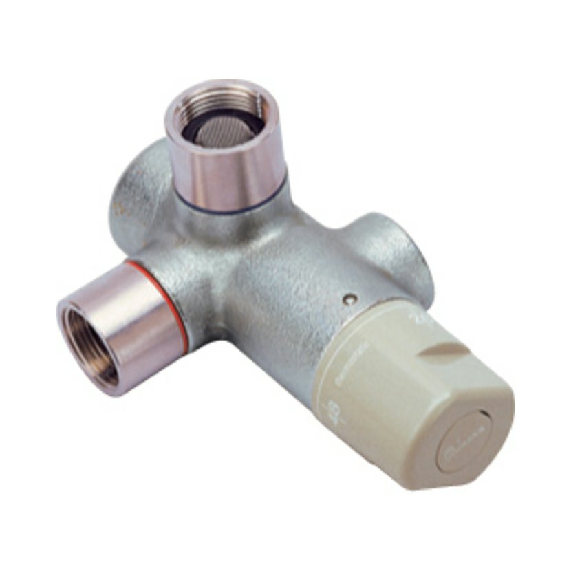 Směšovací termostat pro 1 - 6 výtokových míst (3/4“) MINICASTOR Bezpečnostní funkce proti opaření Nerezové filtry a zpětné klapky Po nastavení teploty může být oliva zajištěna v dané pozici