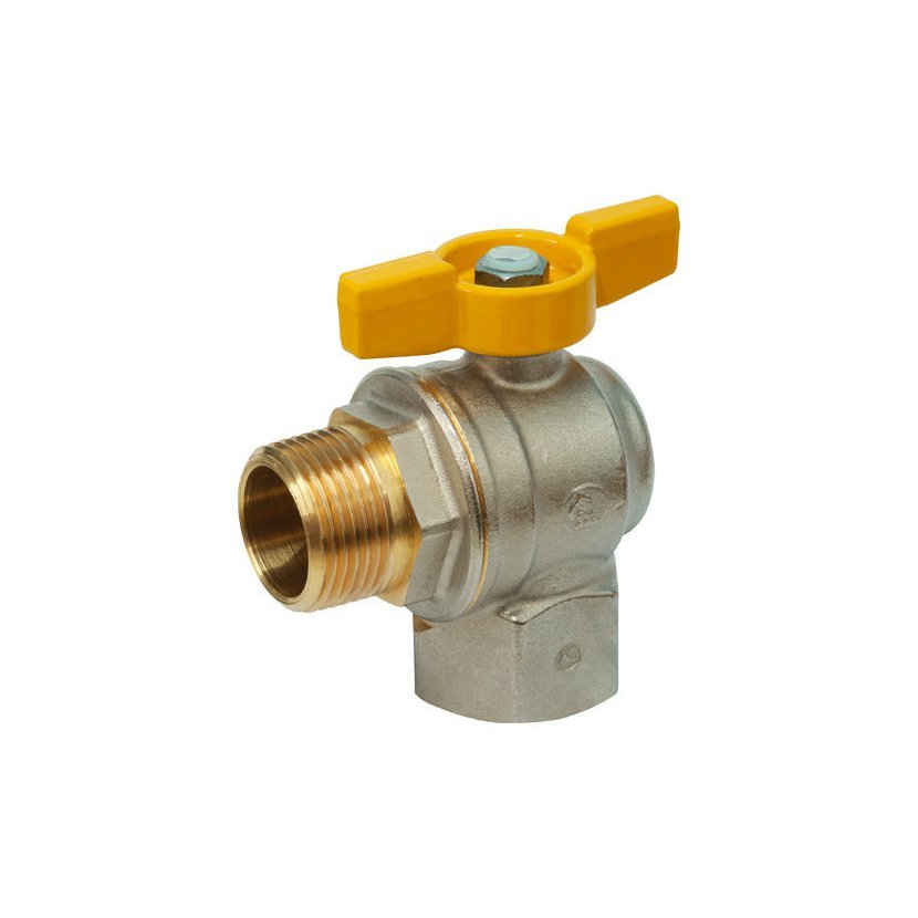 Kulový kohout plnoprůtokový s vnitřním x vnějším závitem, rohové provedení, s ovládací vrtulkou - žlutá, niklovaný, s vysokou teplotní odolností 650 °C.
