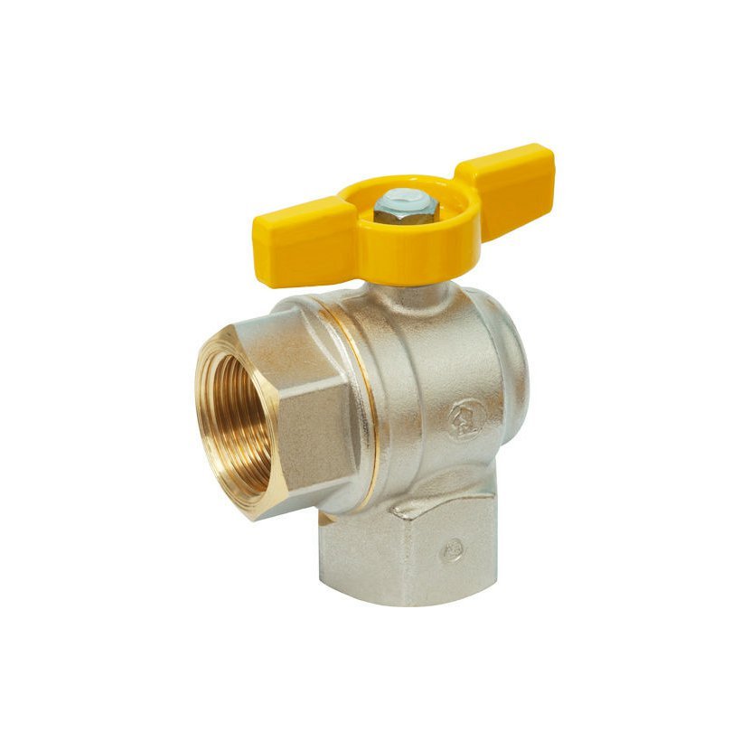 Kulový kohout plnoprůtokový s vnitřními závity, rohové provedení, s ovládací vrtulkou - žlutá, niklovaný, s vysokou teplotní odolností 650 °C.