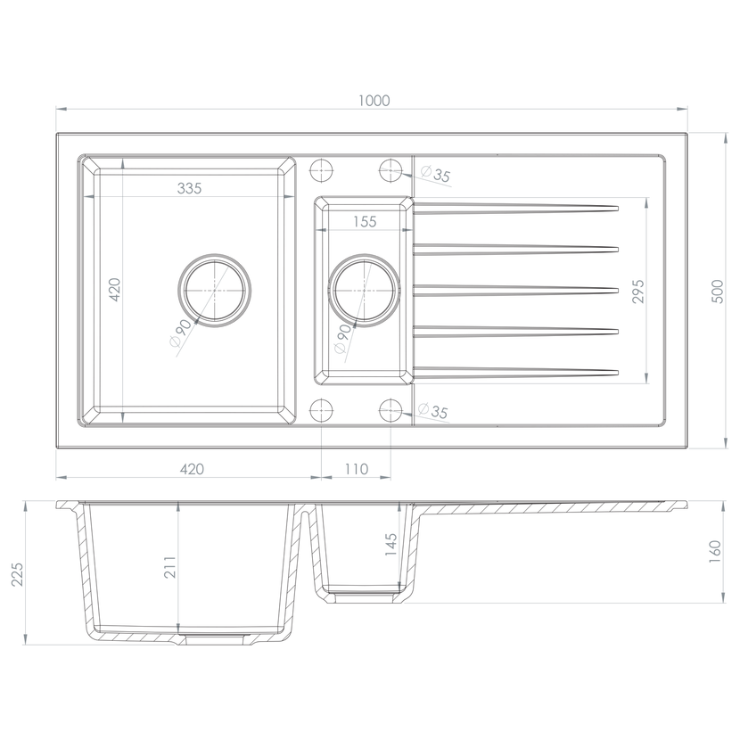 Parametry produktu  Granitový vestavný dřez s odkapem a vaničkou, 100x50cm, černá