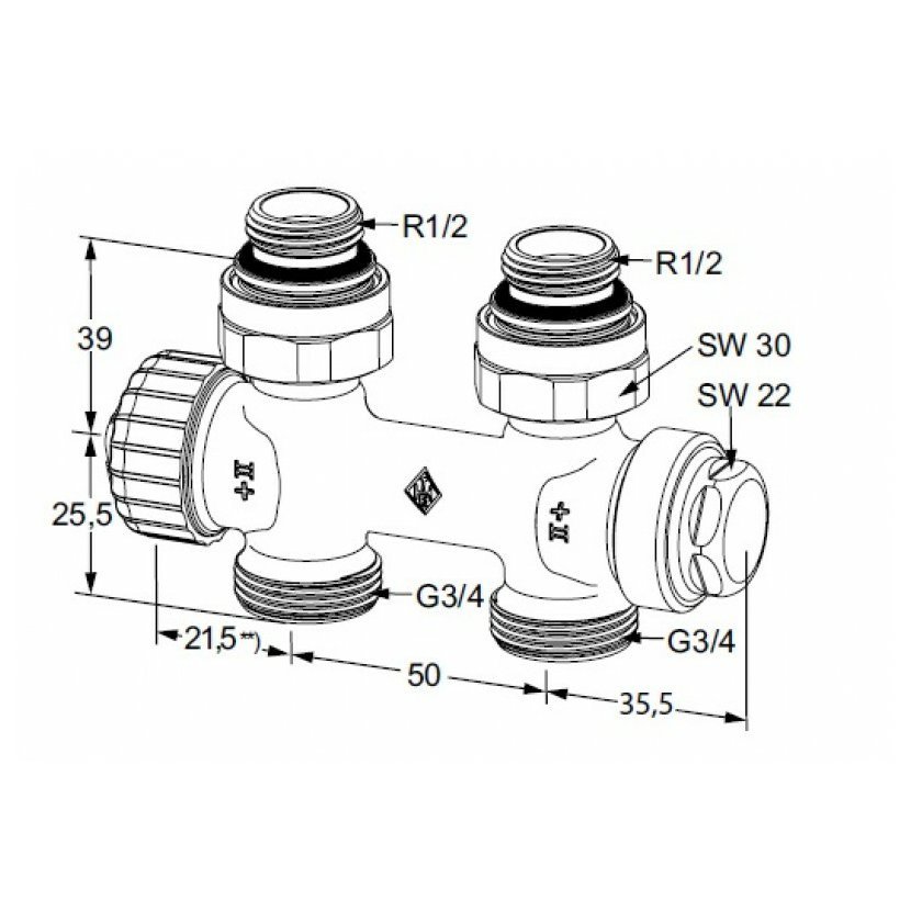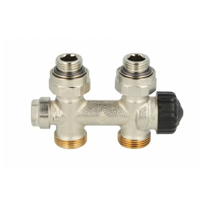 Radiátorový ventil pro otopná tělesa s dvoubodovým připojením, připojení R1/2 a G3/4 Multilux je radiátorová připojovací garnitura pro připojení otopných žebříků nebo otopných těles bez ventilové vložky se spodním připojením s roztečí 50 mm.