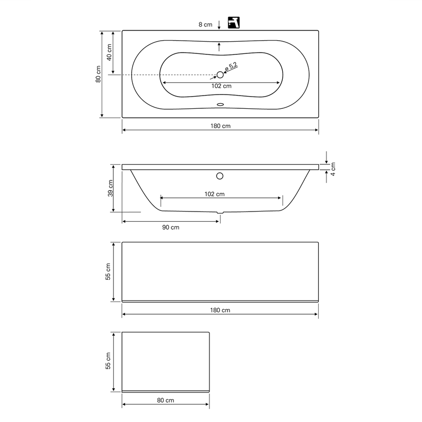 Vana s pohodlně tvarovanými stěnami pro opření zad na obou stranách a odtokem umístěným uprostřed.