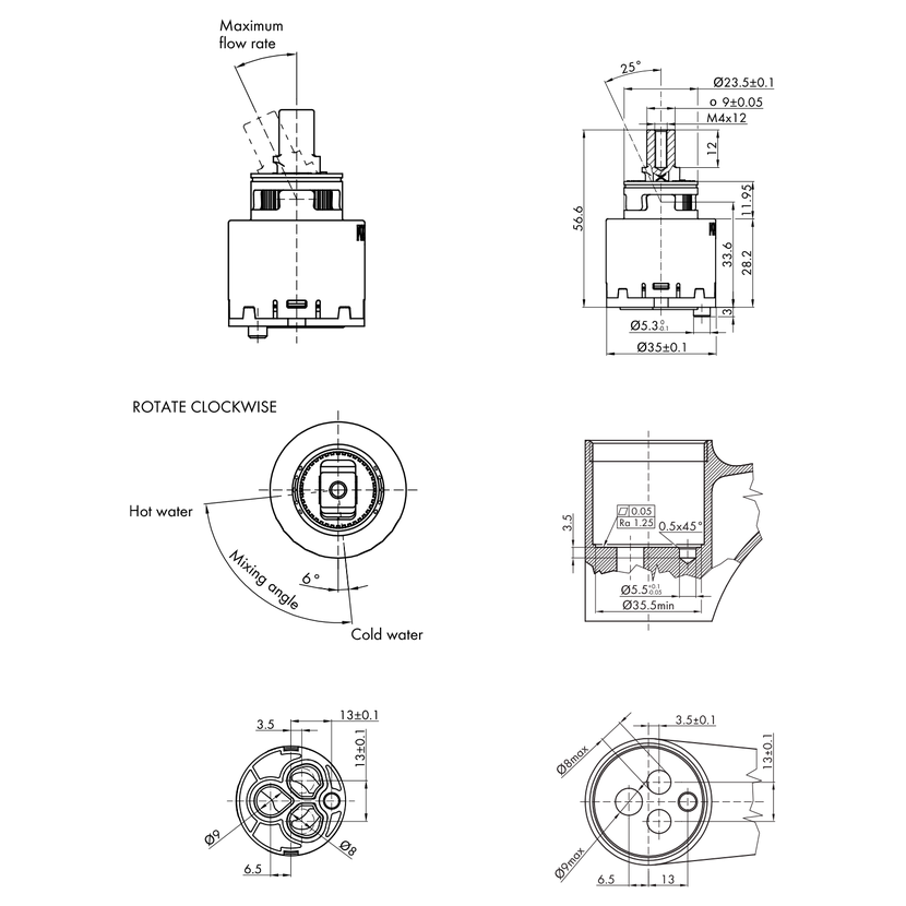 Systém úspory spotřeby vody a energie: V základní poloze vytéká studená voda, postupným otáčením páky doleva se přidává voda teplá. Průtok vody je regulován zvednutím páky baterie.