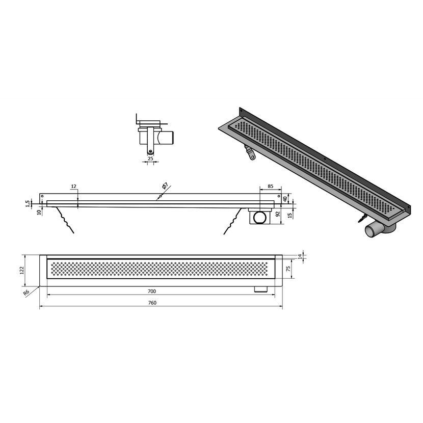 Parametry produktu KROKUS nerezový podlahový žlab s roštem, ke stěně, L-760, DN50