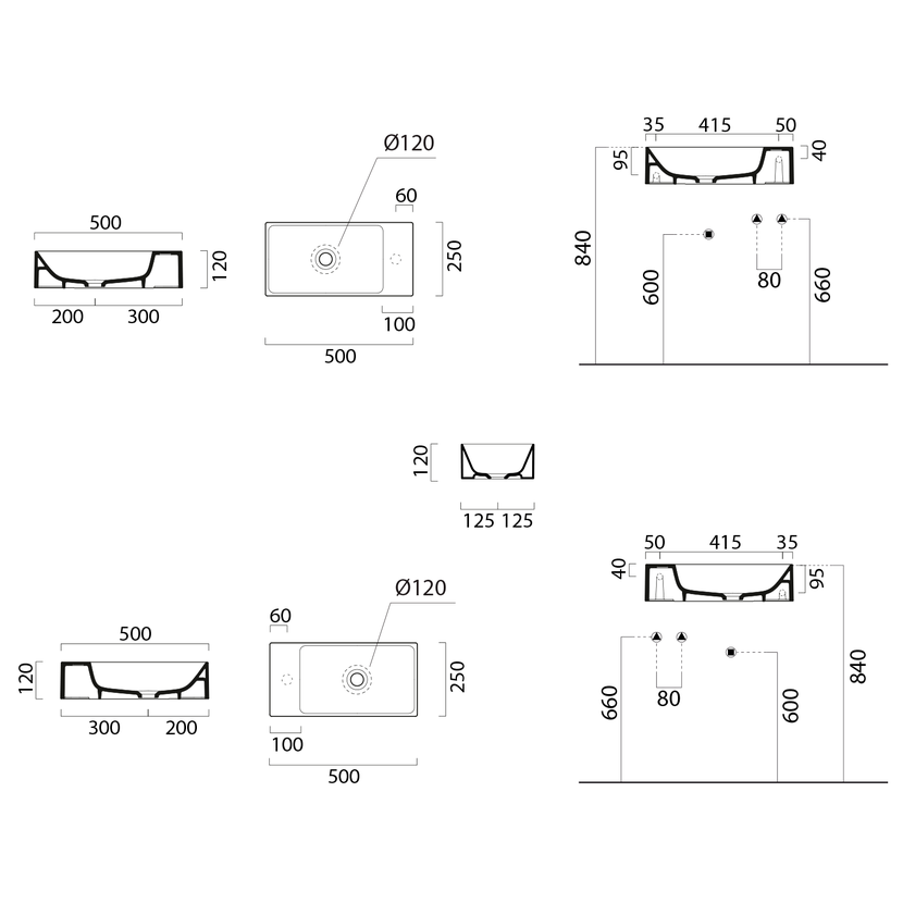 Parametry produktu KUBE X keramické umývátko 50x25cm, bez otvoru, pravé/levé, cenere mat