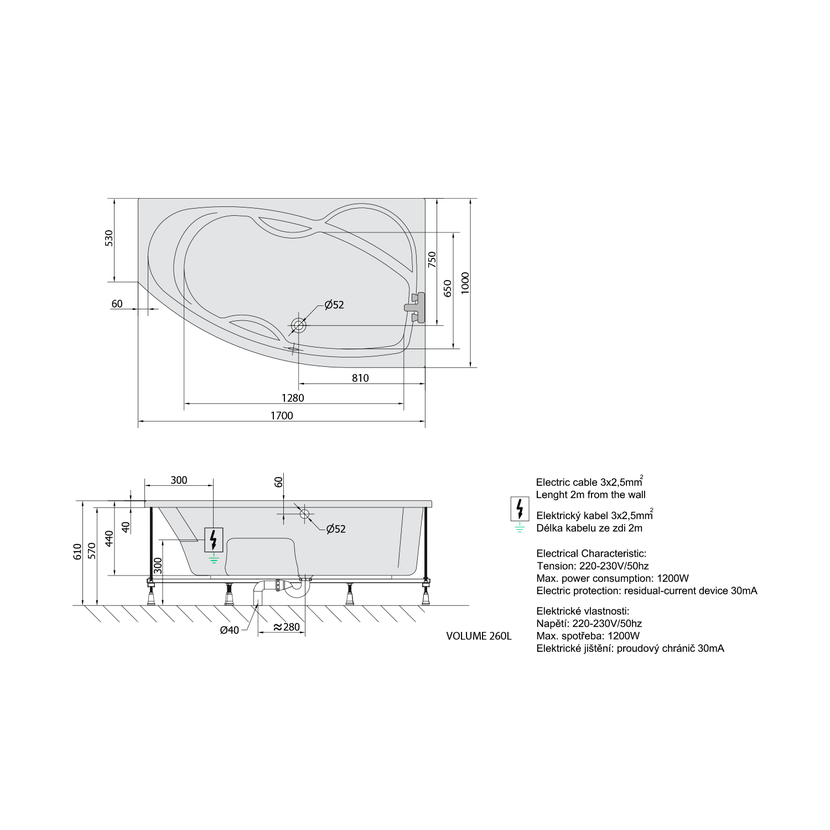 Parametry produktu MAMBA R hydromasážní vana, 170x100x44cm, Highline Hydro-Air, chrom