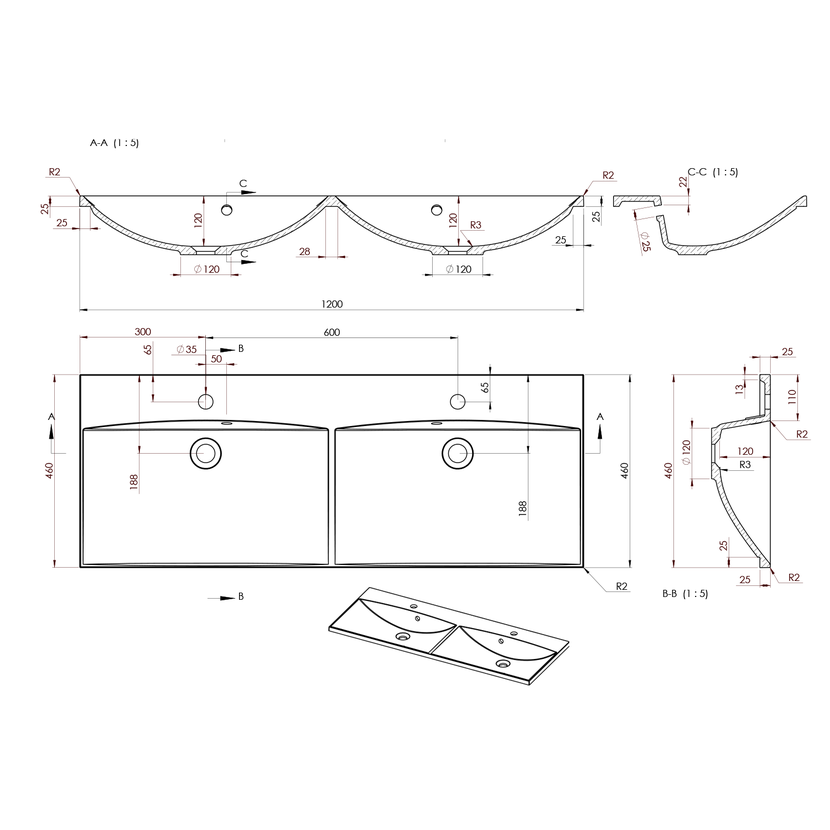 Parametry produktu  MARIA dvojumyvadlo, litý mramor, 120x46cm, bílá