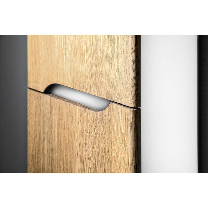 Série MEDIENA je kombinací bílé matné barvy a zásuvek z masivního dřeva, které svým zaoblením kopírují tvar keramických umyvadel SAND od italského výrobce GSI. Zásuvky s netradičním tvarem výřezu pro otvírání jsou vybaveny výsuvy BLUM s funkcí tlumení BLUMOTION s doživotní zárukou. Skříňky nabízíme buď celé v bílém matném provedení nebo v kombinaci korpus matná bílá a čela zásuvek ve 2 dekorech dubového dřeva (voskový olej dub natural a dub graphite). Šířky skříněk jsou 60, 80, 100 a 120 cm. V nabídce jsou též 2 typy doplňkových policových skříněk. Skříňku s prádelním košem získáte jednoduchým vyjmutím spodní police u doplňkové skříňky šíře 35 cm a instalací látkového prádelního koše na suchý zip.