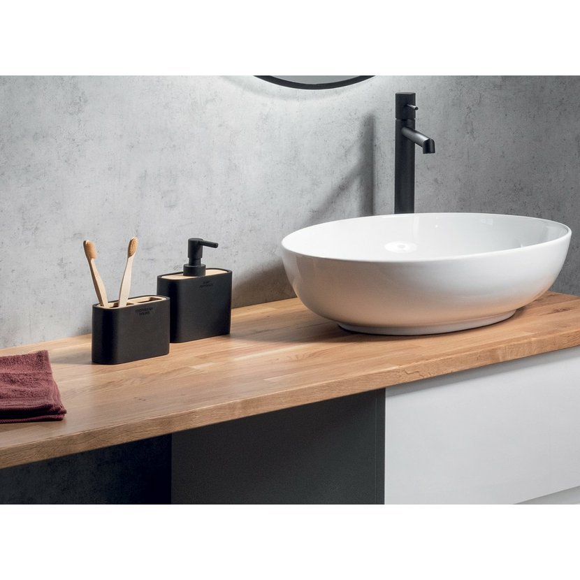 Kombinace dřeva a bílé a černé barvy je nesmrtelná. Ve spojení se zaoblenými hranami činí kolekci doplňků na postavení NINFEA elegantní a neodolatelně krásnou. Oko potěší a užitek přinese v každé koupelně.
