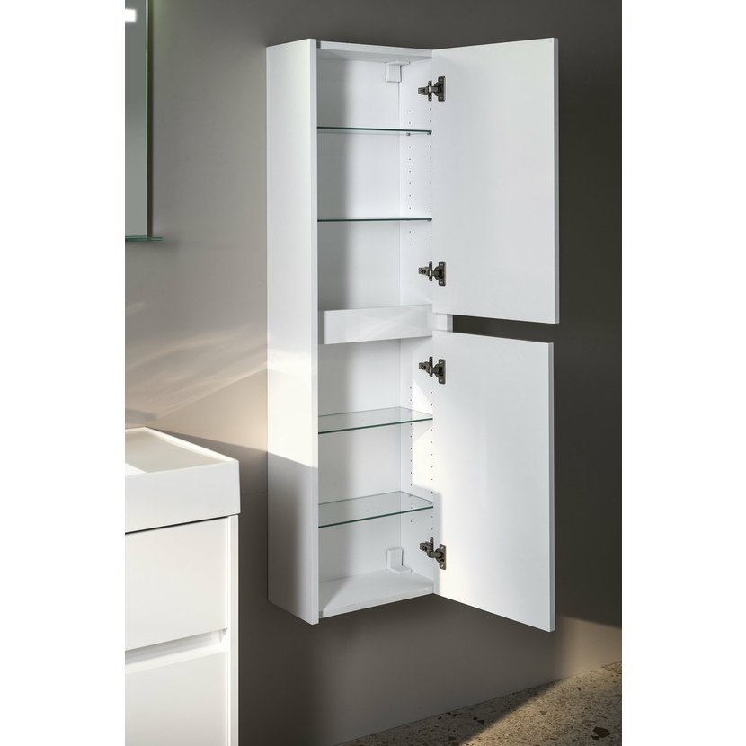 Skříňky nabízíme v bílém lesklém provedení a ve 2 dekorech lamina se strukturou dubového dřeva v šířkách 60, 70, 85 a 100 cm. Série je doplněna 2 typy doplňkových vysokých policových skříněk. Skříňku s prádelním košem získáte jednoduchým vyjmutím spodní police u doplňkové skříňky šíře 35 cm a instalací látkového prádelního koše na suchý zip.