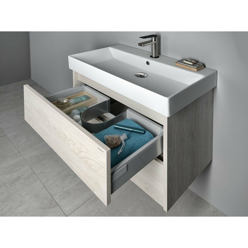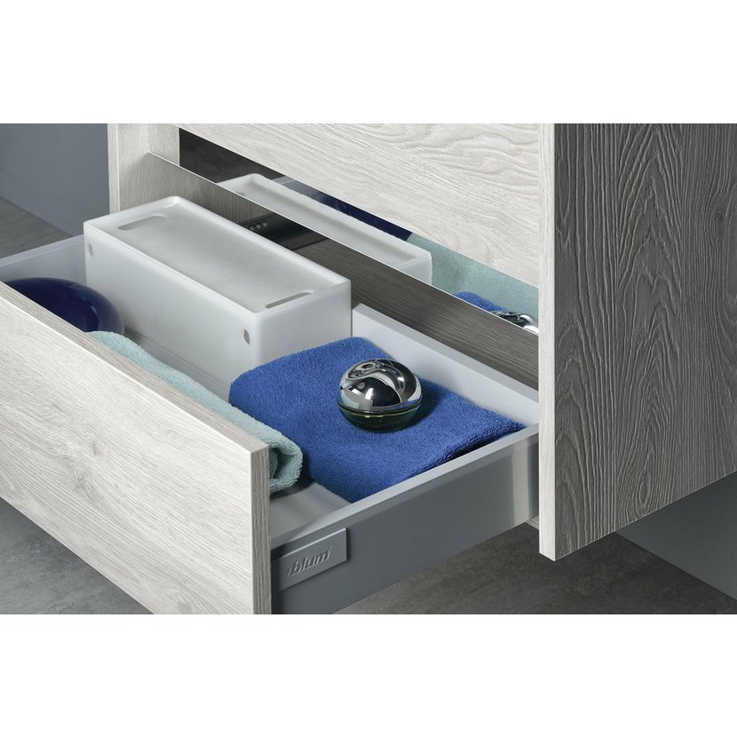Skříňky nabízíme v bílém lesklém provedení a ve 2 dekorech lamina se strukturou dubového dřeva v šířkách 60, 70, 85 a 100 cm. Série je doplněna 2 typy doplňkových vysokých policových skříněk. Skříňku s prádelním košem získáte jednoduchým vyjmutím spodní police u doplňkové skříňky šíře 35 cm a instalací látkového prádelního koše na suchý zip.