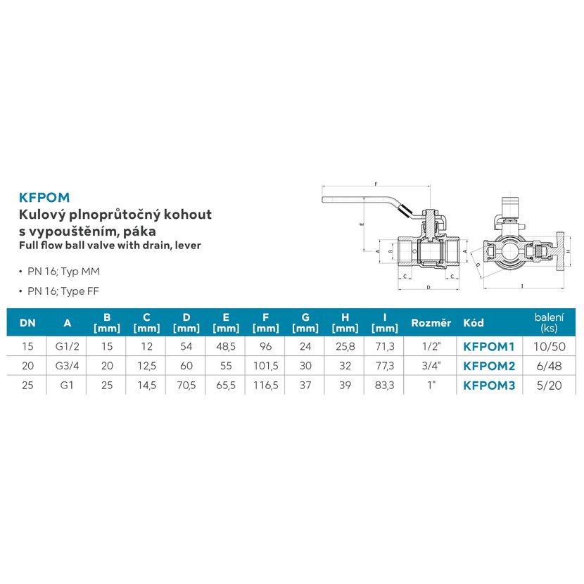 Kulový plnoprůtočný kohout s vypouštěním, páka MM 3/4"