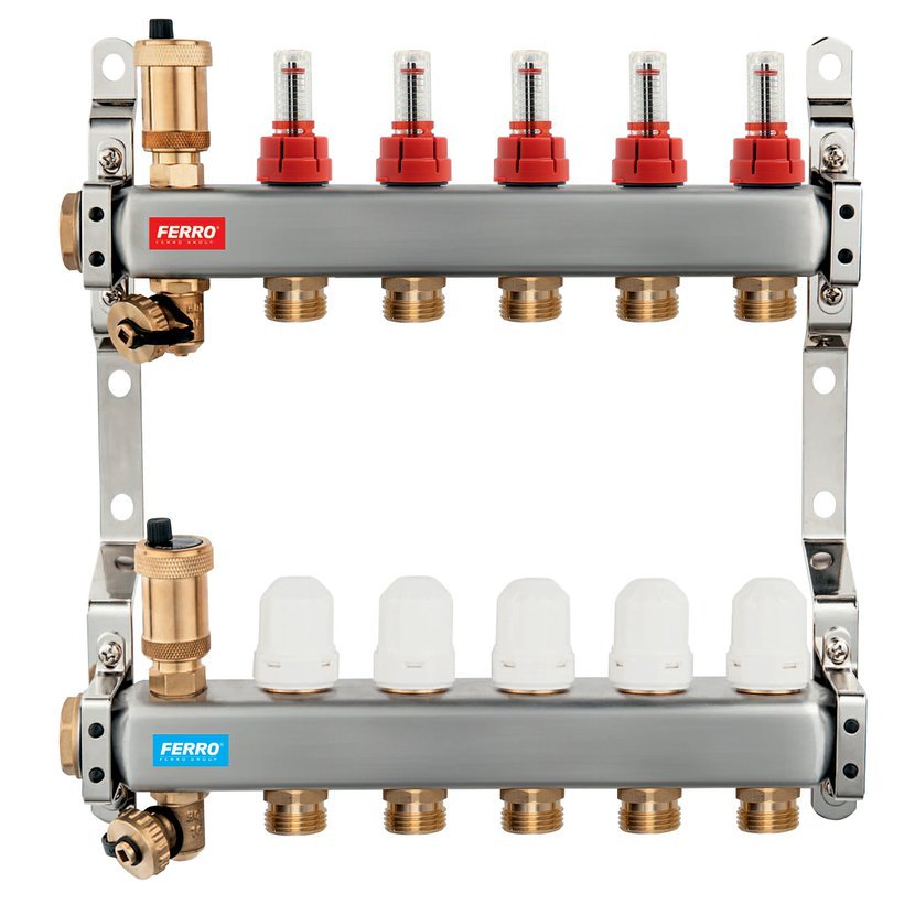 Rozdělovač s uzavíracími ventily a regulačním šroubením s průtokoměry pro podlahové vytápění, připojení G1", výstup pro svěrné šroubení G3/4" s eurokonusem. Rozdělovač je možné doplnit čerpadlovou sestavou GM40GPA a kulovými kohouty KFPS3. Doplňky rozdělovače najdete v sekci Příslušenství k podlahovému topení.