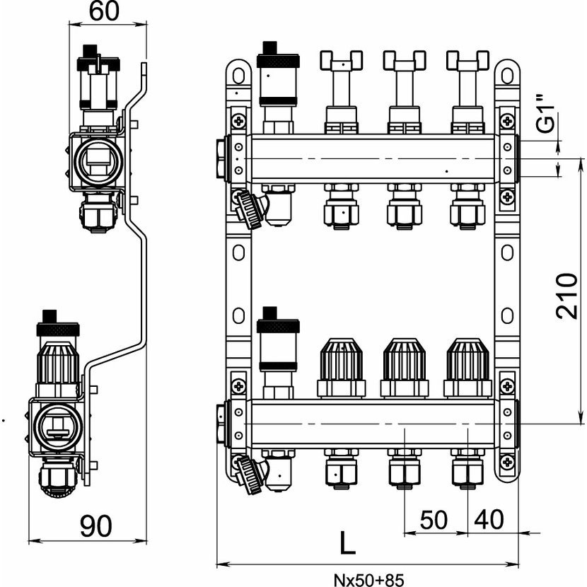 Rozdělovač s uzavíracími ventily a regulačním šroubením s průtokoměry pro podlahové vytápění, připojení G1", výstup se svěrným šroubením AL-PEX G1/2", které je součástí balení. Rozdělovač je možné doplnit čerpadlovou sestavou GM40GPA a kulovými kohouty KFPS3.