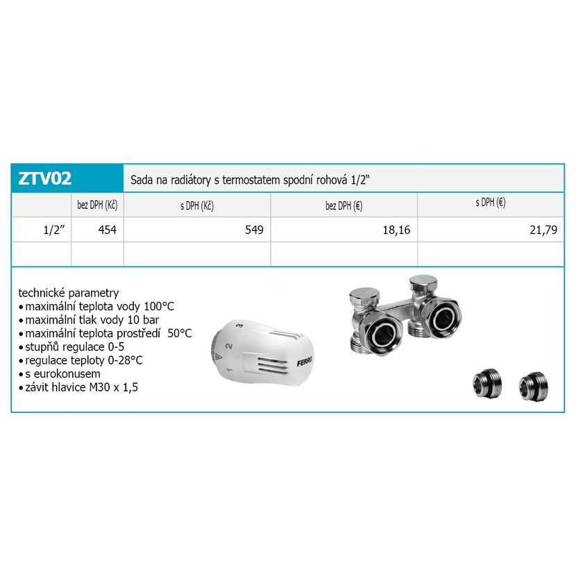 Sada na radiátory s termostatem spodní rohová 1/2" technické parametry: