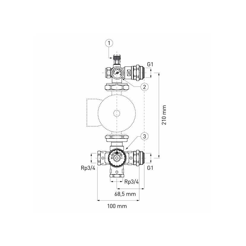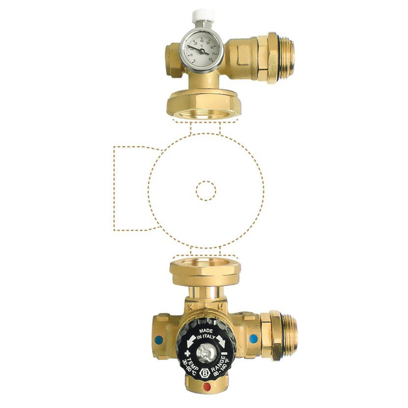 4-cestný termostatický ventil s připojením 3/4” Teploměr 0-80 °C ruční odvzdušnovač šroubení na čerpadlo 6/4" pro rozdělovače s roztečí 210 mm rozsah regulace 25 - 50 ° C