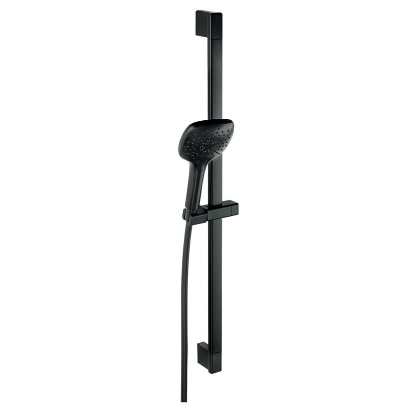 Sprchová souprava černá-mat pro sprchové baterie obsahuje 3-polohovou ruční sprchu s průtokem max vody 6 l/min, posuvný držák sprchy v délce 780 mm a kovovou sprchovou hadici s anti-twist v délce 150 cm..Rozteč montážních otvorů 750 mm.