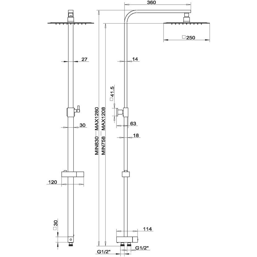 Prvotřídní provedení černá-mat. Set je vhodný pro připojení k vanové nebo sprchové baterii se spodním vývodem. Součástí balení je hlavová sprcha s průměrem 250 x 250 mm, kovová hadice 150 cm a 1-polohová ruční sprcha. Výška setu je 830 - 1275 mm. Součástí balení je připojovací hadička v délce 70 cm.