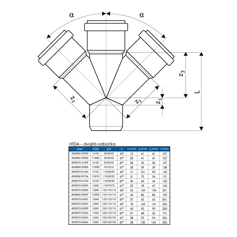 Parametry produktu  OSMA HTDA dvojitá odbočka DN 125/110/110/87° 17355