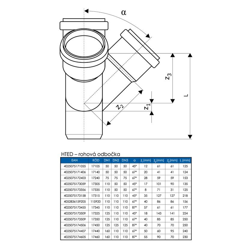 Parametry produktu  OSMA HTED rohová odbočka DN 110/110/110/67° 115920