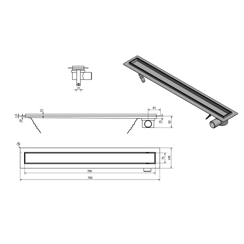 Parametry produktu PAVINO nerezový podlahový žlab s roštem pro dlažbu, L-760, DN50