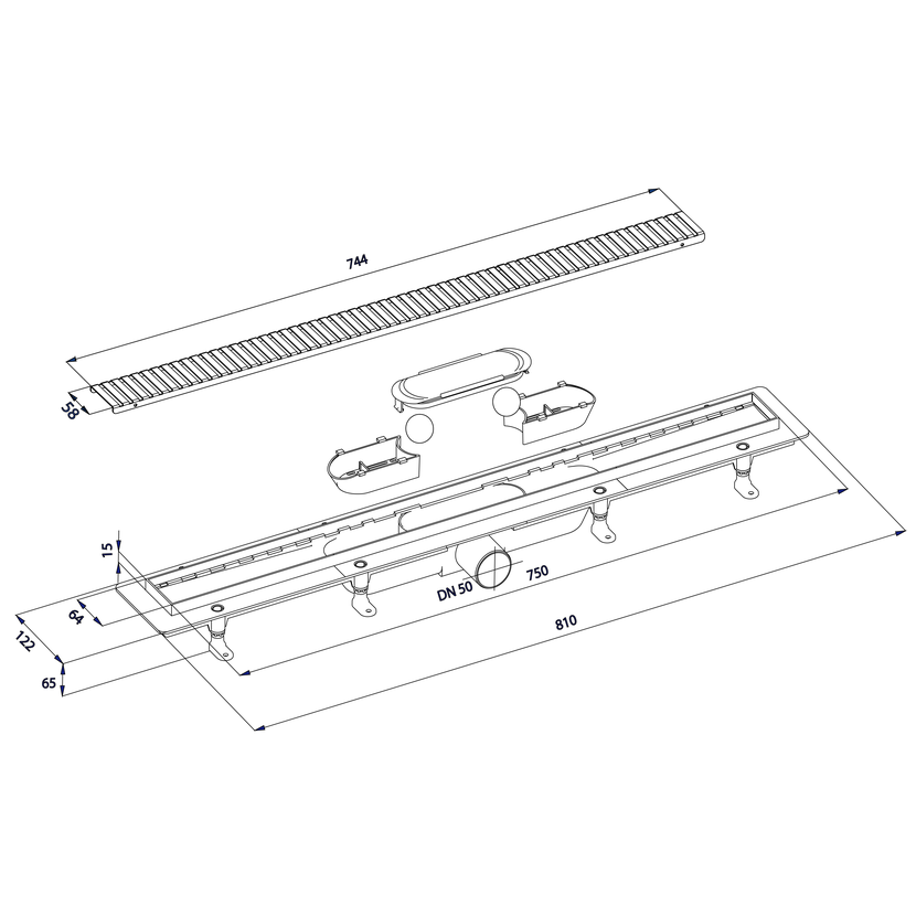 Sprchový kanálek s nerezovým roštem, DN50, 810x122x65 mm
