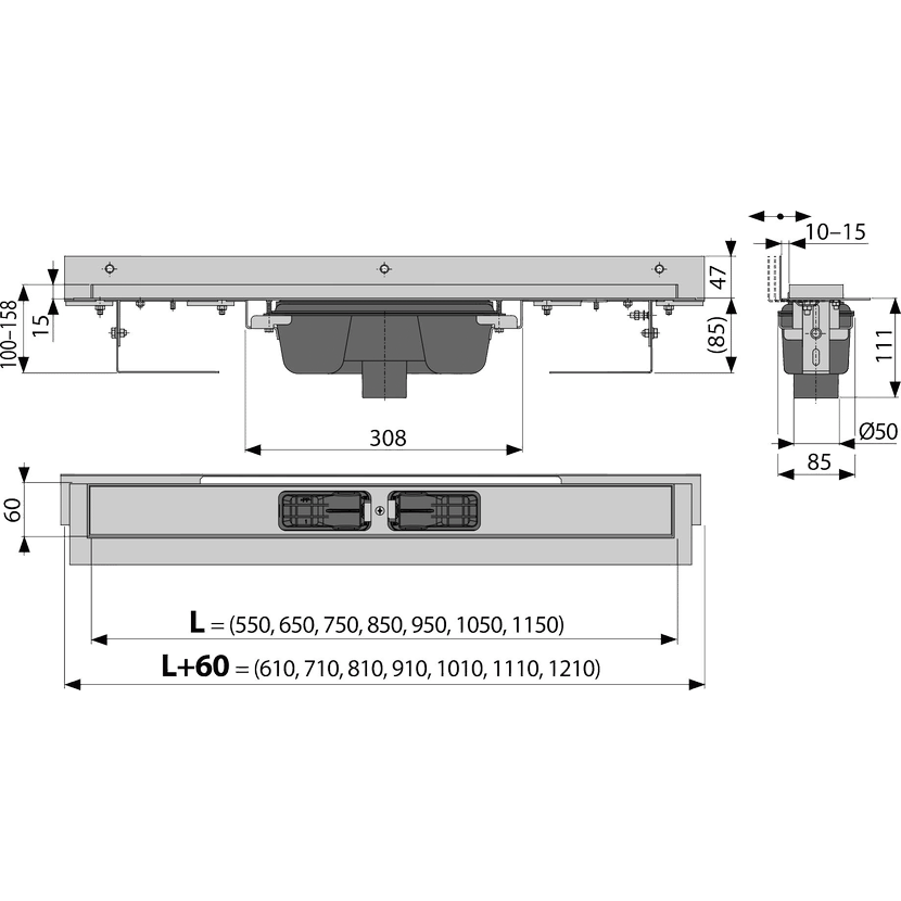 Alcaplast APZ1004 550-1150 mm Podlahový žlab s okrajem pro perforovaný rošt a s nastavitelným límcem ke stěně, svislý