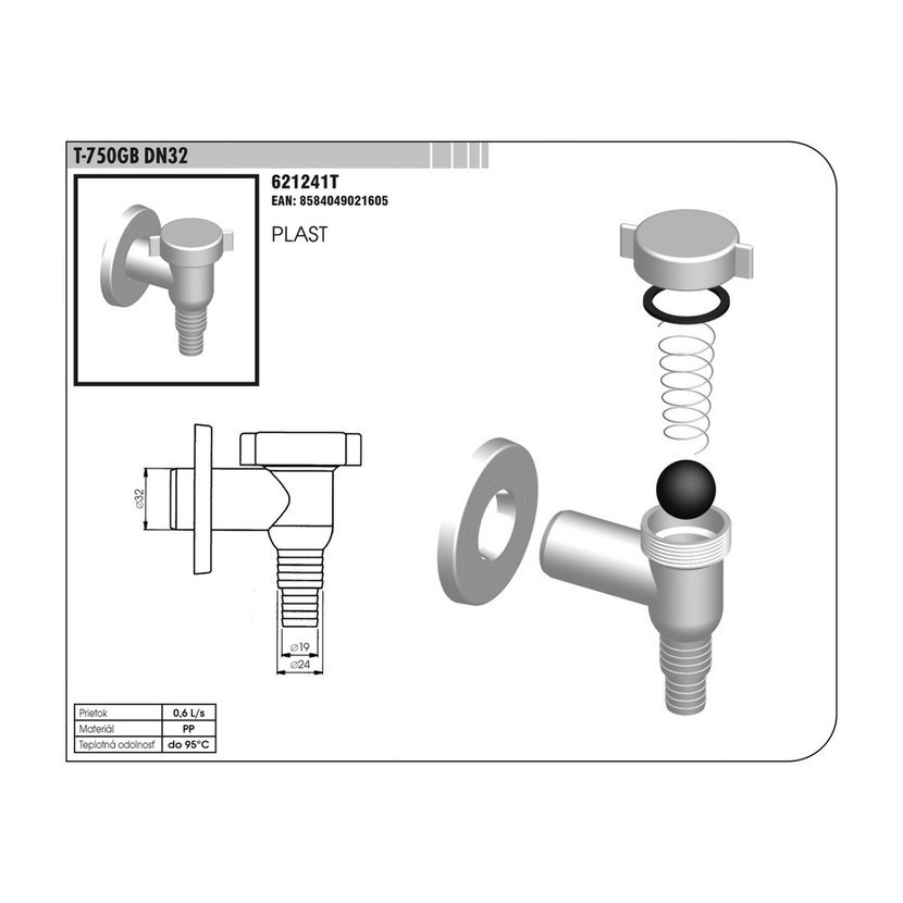 Pračkový sifon, DN 32, nadomítkový s kuličkou, plast