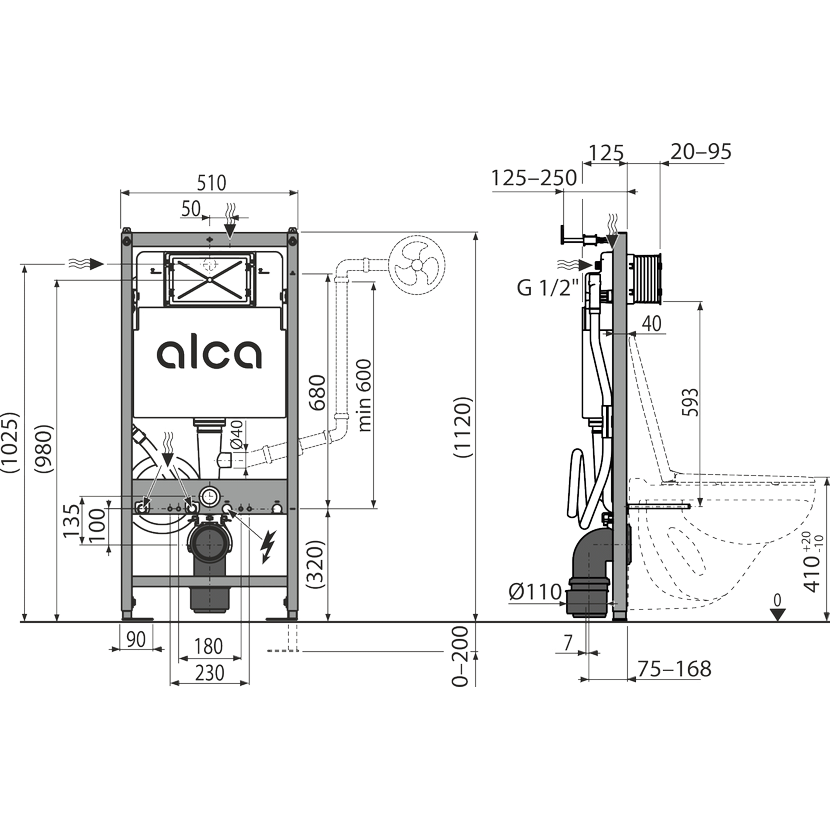 - Pro montáž závěsného WC s připojovací roztečí 180 mm nebo 230 mm