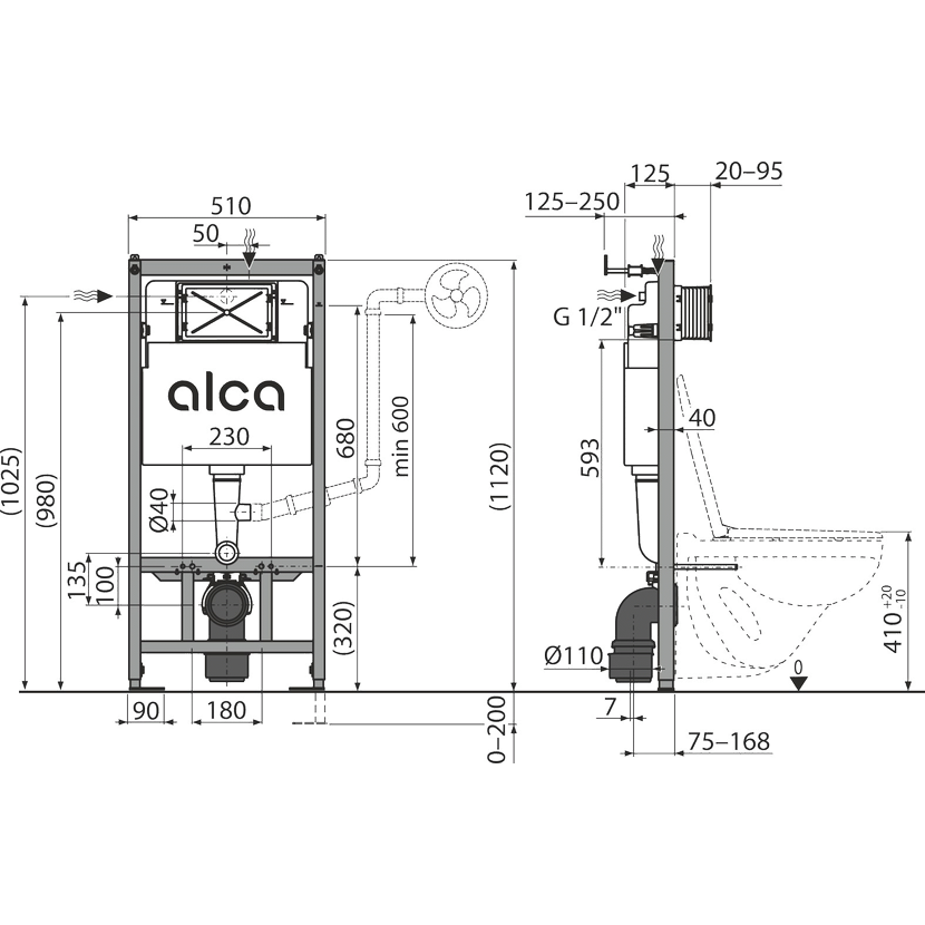 - Pro montáž závěsného WC s připojovací roztečí 180 mm nebo 230 mm