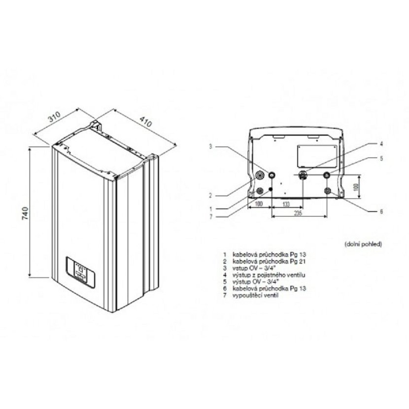 Výkon 1 - 6 kW Elektr. napětí / Frekvence 3 x 230 V/400 V, 50 Hz Účinnost 99,5% Min. - Max. provozní teplota OV 25 - 85°C Max. výkon oběhového čerpadla 50 kPa Objem expanzní nádoby 8 l Min. - Max. provozní tlak OV 0,8 - 3 bar Doporučený provozní tlak OV 1 - 2 bar Elektrické krytí IPX4D Připojení OV G 3/4“ Rozměry (v,š,h) 740x410x315 mm Hmotnost (bez vody) 34 kg