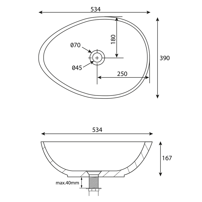 Parametry produktu  PUNC betonové umyvadlo na desku, včetně výpusti, 53x39cm, černý granit