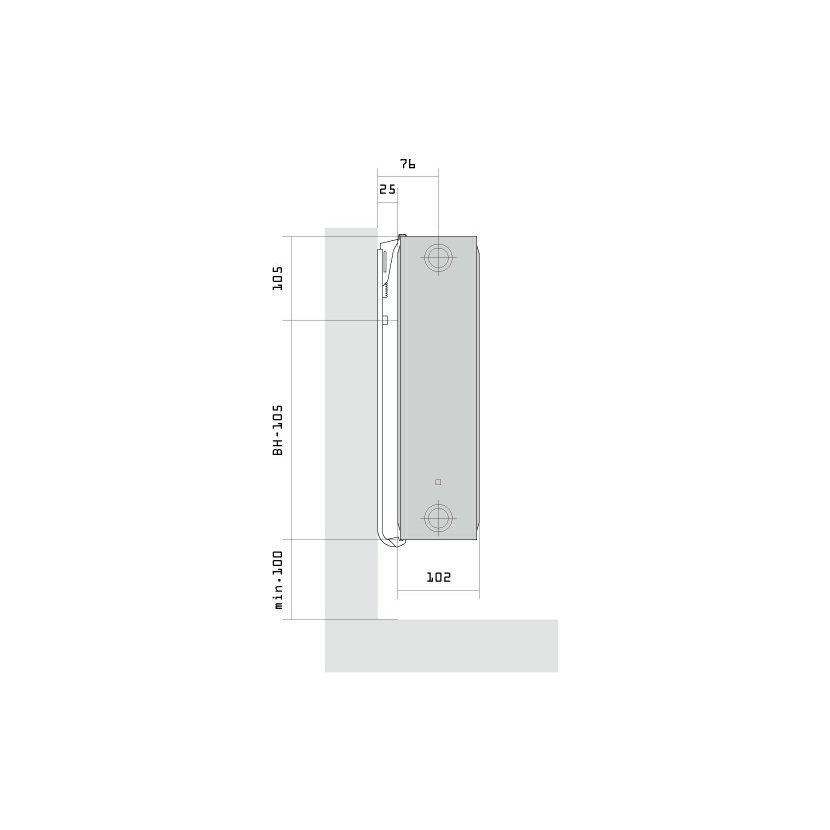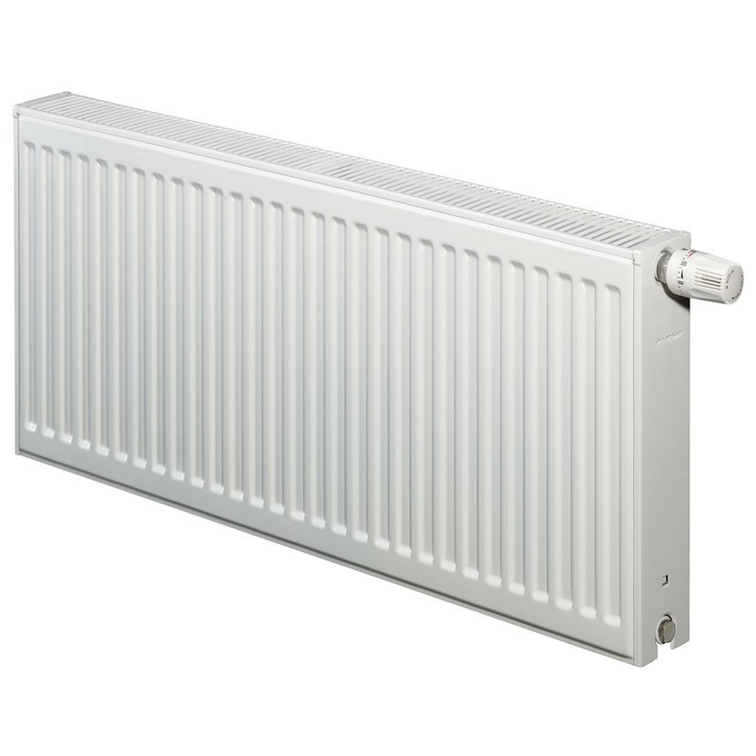 Deskové radiátory s konvekčními prvky a vestavěným ventilem, boční strany chráněné kryty, horní strana s krycí mřížkou. Vestavěný komplet přípojných prvků umožňuje instalovat přívod vody do radiátoru jak z boku, tak zespod. Dva dolní přípojné otvory pro instalaci přívodu z podlahy a čtyři boční přípojné otvory v každém rohu radiátoru. Všechny otvory s vnitřním závitem 1/2". Přívod z podlahy u radiátorů CV11 standardně zprava. U radiátorů CV22 a CV33 může být proveden také zleva – po otočení radiátoru. Přívodní potrubí by mělo být připojeno vždy dál od hrany radiátoru, odvodní potrubí pak blíže hrany radiátoru. Radiátor je osazen ventilovou vložkou Heimeier nebo Oventrop s výchozí regulací. Technické údaje Tepelný výkon 75/65/20°: 1367W Materiál: hlubokotažný nízkouhlíkový plech válcovaný za studena FePO1 Tloušťka plechu: ze kterého se lisují desky radiátorů: 1.25 mm ze kterého se vyrábí konvekční žebrování: 0.5 mm Rozteč vertikálních vodních kanálků: 33 1/3 mm Výšky radiátorů: 200, 300, 450, 500, 600, 900 mm Délky radiátorů: 400, 500, 600, 700, 800, 900, 1000, 1100, 1200, 1400, 1600, 1800, 2000, 2300, 2600, 3000 mm Maximální provozní tlak:10 bar Zkušební tlak: 13 bar (při výrobě) 12 bar (po instalaci) Maximální teplota: 110°C Barva: RAL 9016 bílá, jiné na objednávku Základová vrstva: KTL II - kataforéza druhé generace Povrchová vrstva: elektrostaticky nanášená Výroba: splňuje BS EN ISO 9001, certifikáty FM 32533 a BS EN ISO 14001 certifikát EMS 75685 kontrolovaný organizací British Standards Institution Prohlášení o shodě s normou PN-EN 442 Hygienický atest: HK/B/0050/01/2006 Záruka: 10 let