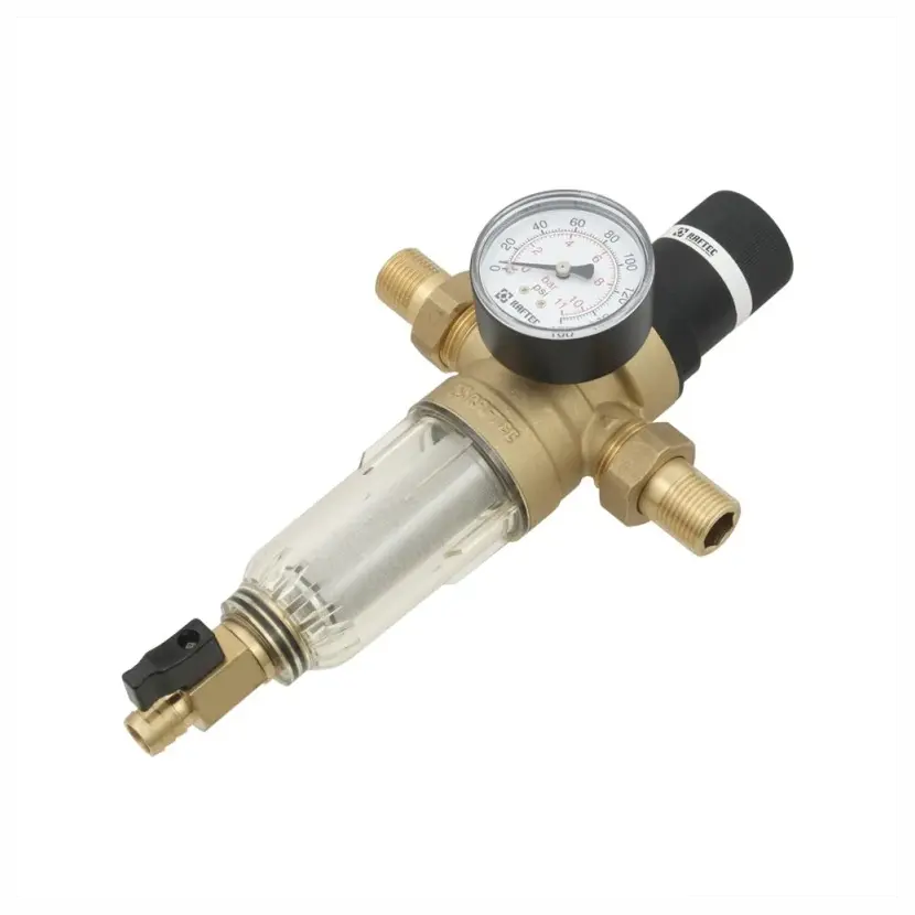 Variabilní provedení reduktoru s manometrem umožňuje vizuální odečet tlaku dopravovaného média za zařízením. Vestavěný filtr slouží k čištění proudící vody od nerozpustných mechanických nečistot při teplotě dopravovaného média do 40 °C a tlaku do 10 barů.