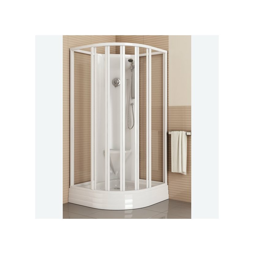 Šestidílný čtvrtkruhový sprchový box Supernova v bílém provedení a s výplní z neprůhledného skla s dekorem Grape. Sklo je ošetřeno ochrannou vrstvou RAVAK AntiCalc®. Posuvný systém otevírání. Včetně vybavení.