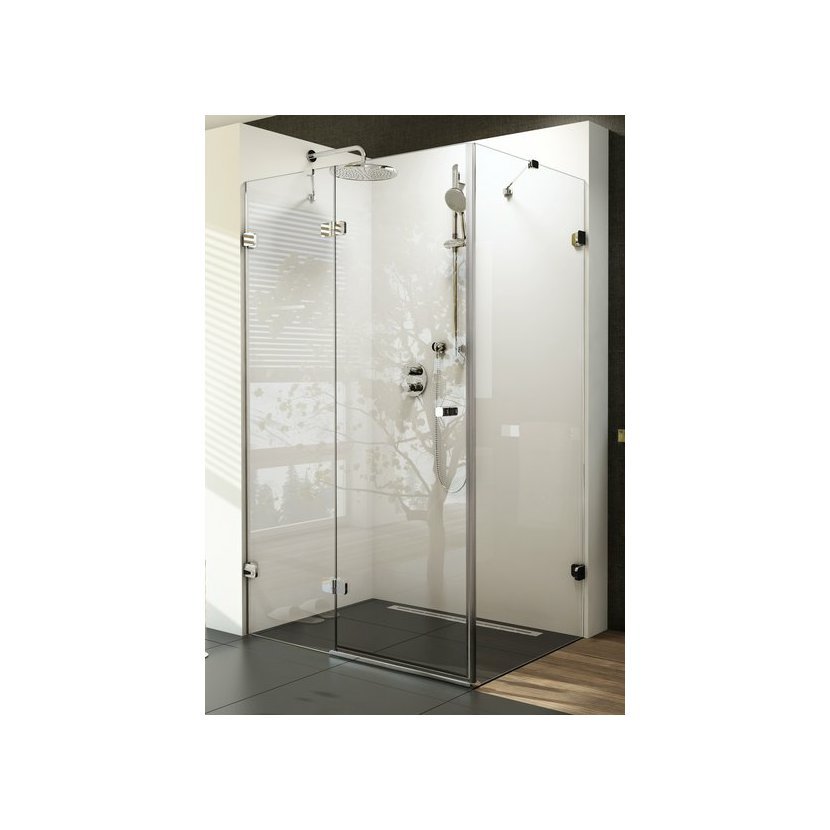 Bezpečnostní sklo rohového sprchového koutu Brilliant s výplní z čirého skla s ochrannou vrstvou RAVAK AntiCalc®. Výrobek je složen ze sprchových dveří a pevné stěny. Pro kompletní sprchový kout je nutné přikoupit B-SET v provedení lesklý chrom. Pantový systém otevírání. Levá varianta.