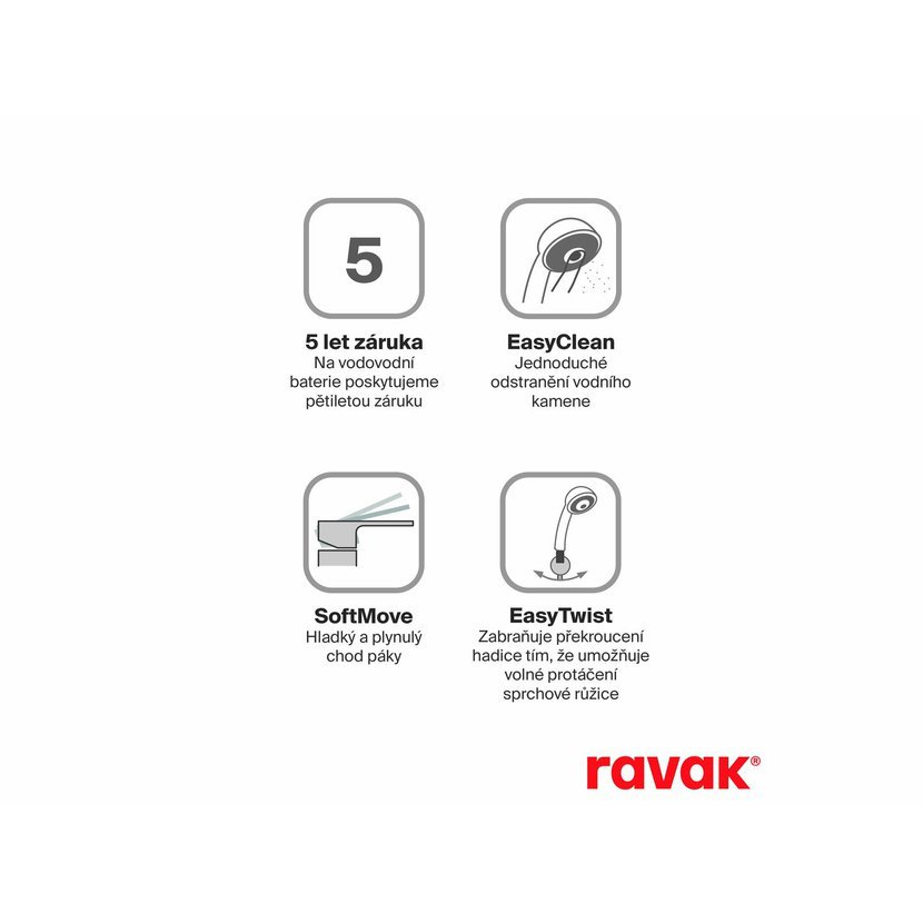 Elegantně štíhlý design těla baterie umožňuje ventilové ovládání. Tento typ ovládání umožňuje přesné a plynulé nastavení průtoku vody a její teploty. Baterie je určena pro R-box. Zapojení vody do R-boxu je na kolmo k vaně. Základní těleso RB 07A.50 není součástí podlahové baterie a je nutné jej dokoupit. R-box obsahuje materiál pro přichycení k podlaze, nezahrnuje přípojky pro vedení vody ani jiný vodoinstalační materiál. Na vnější čištění doporučujeme používat přípravek Ravak Cleaner Chrome.