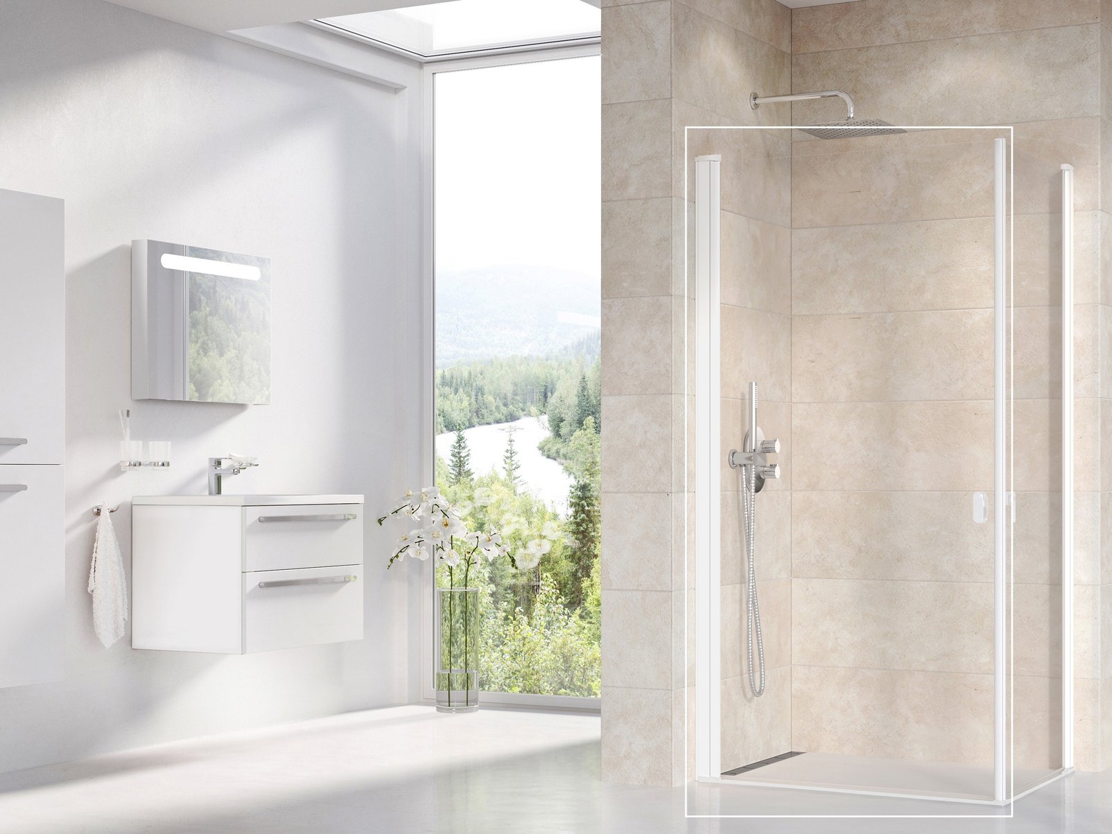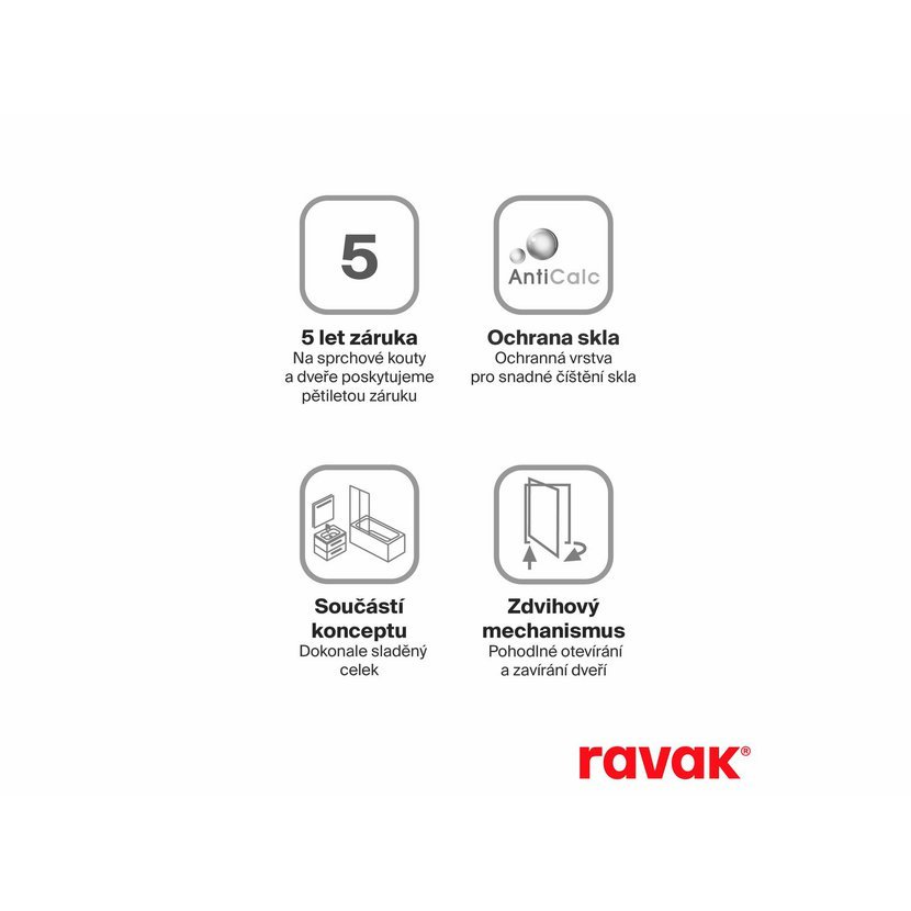 Polovina rohového sprchového koutu Chrome v provedení bílá matná a s výplní z čirého skla s ochrannou vrstvou Ravak AntiCalc®. Pro druhou polovinu rohového sprchového koutu se výrobek kombinuje s CRV1, CRV2 nebo CPS. Pantový systém otevírání.