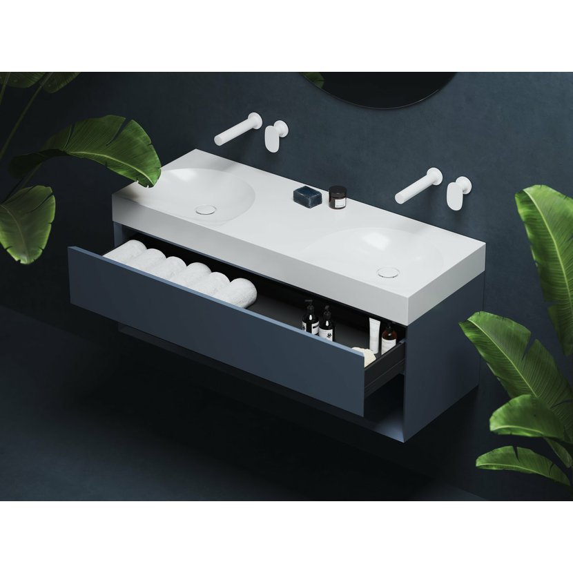 Nábytkové dvojumyvadlo z litého mramoru Lite k instalaci na zeď nebo k zapuštění do závěsné skříňky, bez přepadu. Bílé provedení. Bez otvorů - pro kombinaci s umyvadlovými podomítkovými bateriemi.