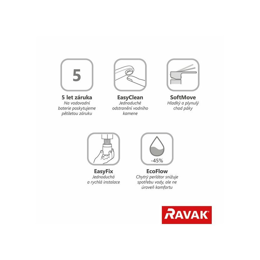 Pro ucelené řešení a designový soulad koupelny doporučujeme kombinovat s ostatními bateriemi Espirit shodného barevného provedení. Na vnější čištění doporučujeme používat čistící přípravek RAVAK Cleaner Chrome.