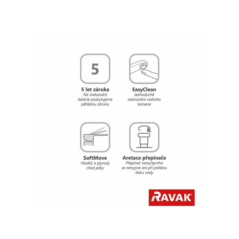 Pro ucelené řešení a designový soulad koupelny doporučujeme kombinovat s ostatními bateriemi Espirit shodného barevného provedení. Na vnější čištění doporučujeme používat čistící přípravek RAVAK Cleaner Chrome.