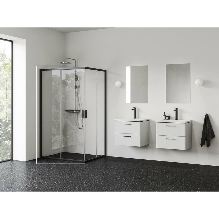 1/2 rohového sprchového koutu Blix II v černém provedení a s výplní z čirého skla s ochrannou vrstvou Ravak AntiCalc®. Posuvný systém otevírání. Kompletní sprchový kout je složen ze dvou sprchových dveří!