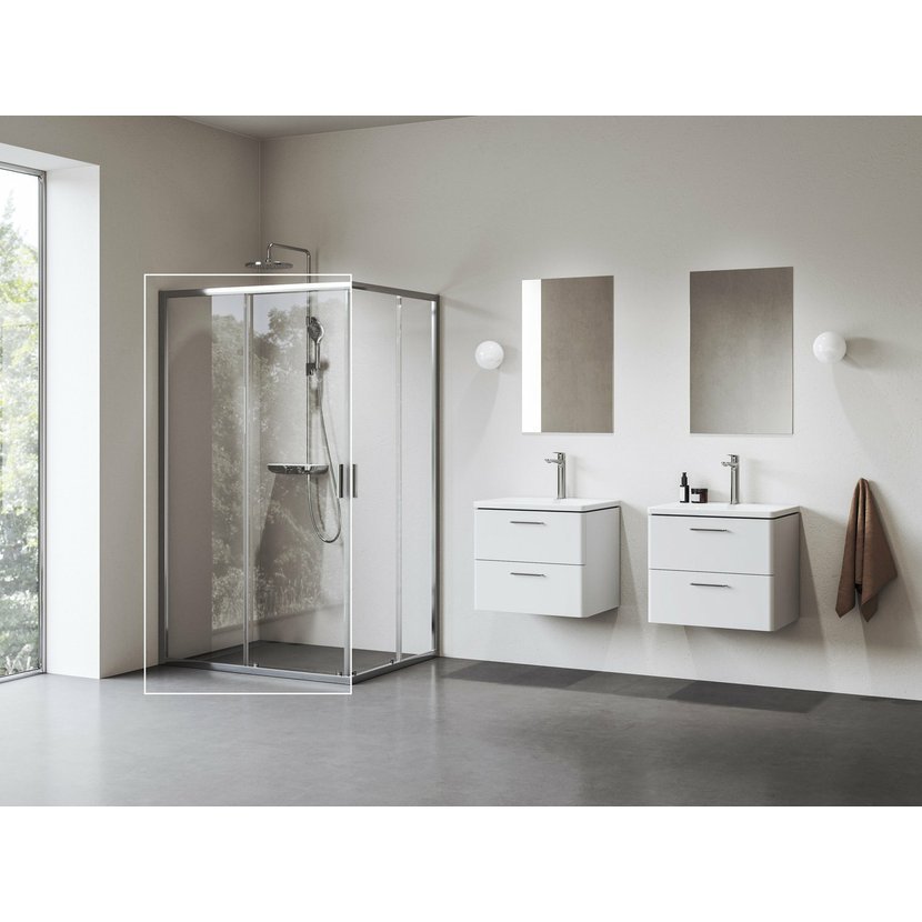 1/2 rohového sprchového koutu Blix II v provedení lesklý chrom a s výplní z čirého skla s ochrannou vrstvou Ravak AntiCalc®. Posuvný systém otevírání. Kompletní sprchový kout je složen ze dvou sprchových dveří!