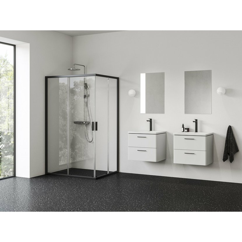 1/2 rohového sprchového koutu Blix II v černém provedení a s výplní z čirého skla s ochrannou vrstvou Ravak AntiCalc®. Posuvný systém otevírání. Kompletní sprchový kout je složen ze dvou sprchových dveří!