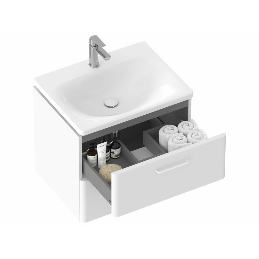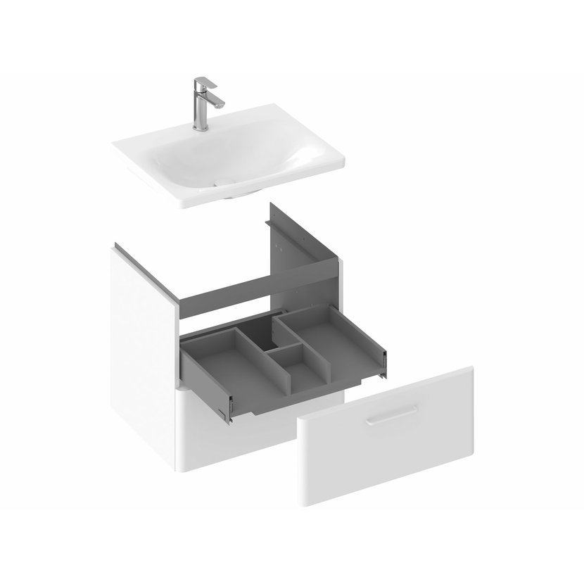 Vnitřní prostor skříňky je v barvě grafit. Dvě praktické zásuvky s pomalým dojezdem nabízí dostatek úložného prostoru. Skříňka má předvrtané otvory pro madla, která nejsou součástí skříňky a je nutné je dokoupit zvlášť ve 2 kusech. Na výběr jsou ve třech barevných provedeních - lesklý chrom, černá nebo bílá. Je určena pod zápustné umyvadlo Balance 60 bez přepadu, doplněné umyvadlovým sifonem s pevnou výpustí. Skříňku lze doplnit také bílou deskou Balance 60 a umyvadlem na desku nebo deskou Balance 120, konzolí desky Balance/Comfort 120, bílým věšákem ručníků Balance II a umyvadlem na desku (např. řady Uni / Uni Slim). Dvě skříňky vedle sebe lze doplnit deskou Balance 120 a získat tak velkorysý úložný prostor i odkládací plochy. Dodáváno ve smontovaném stavu včetně montážní sady (šrouby, panty, záslepky). Skříňka je montována na zeď. Pro ucelené řešení a designový soulad koupelny doporučujeme skříňku SD Balance 60 kombinovat s ostatními výrobky řady Balance II.