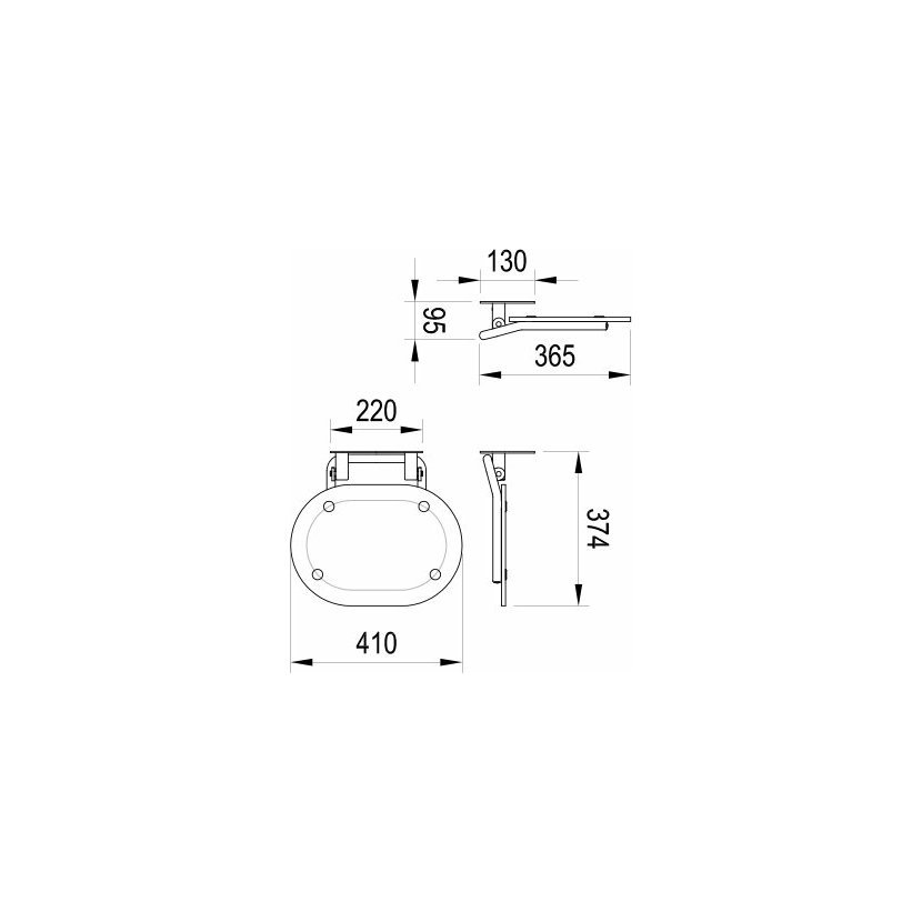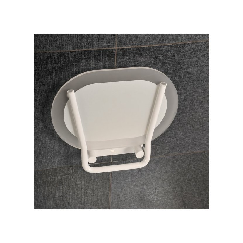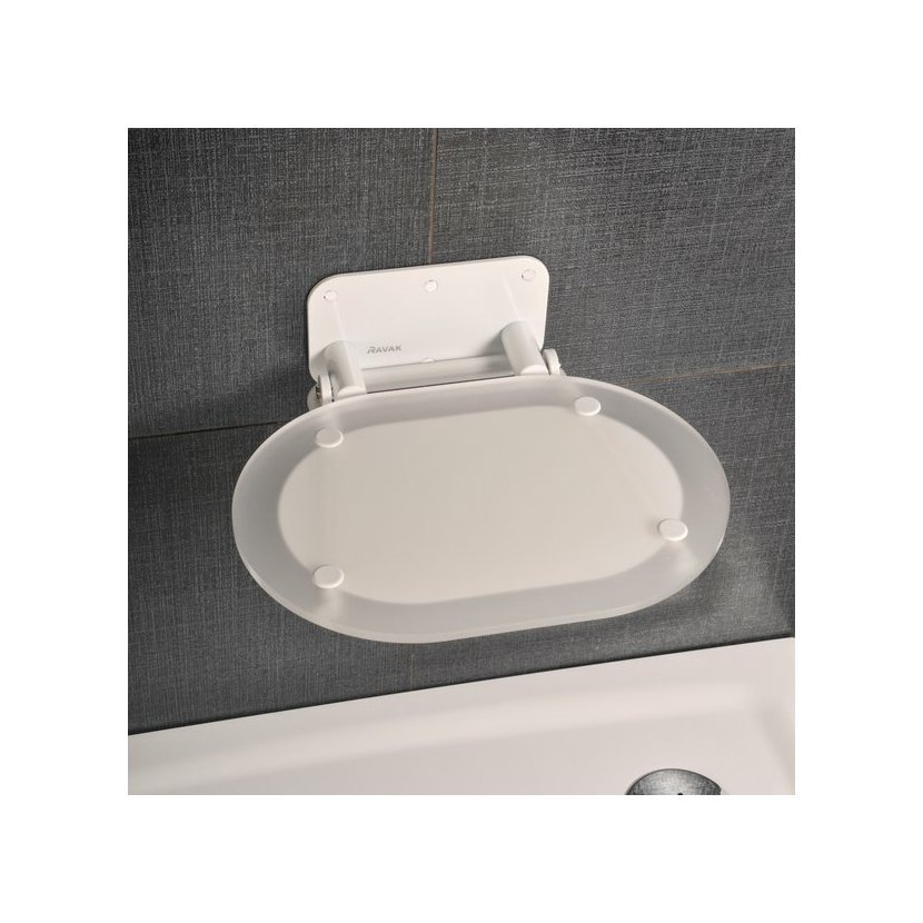 Sklopné sprchové sedátko Chrome. Bílé provedení konstrukce s průsvitně bílým sedákem Clear. Oválný tvar.