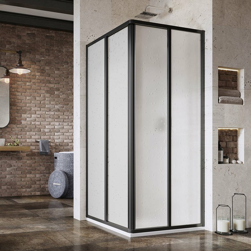 1/2 rohového sprchového koutu Supernova v černém provedení a s výplní z umělé hmoty s dekorem Pearl. S ochrannou vrstvou RAVAK AntiCalc®. Posuvný systém otevírání. Kompletní výrobek je složen ze dvou sprchových dveří.