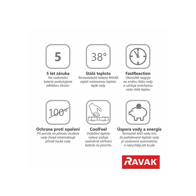 Sprchový sloup s termostatickou baterií lze kombinovat s ostatními výrobky RAVAK. Na vnější čištění doporučujeme používat přípravek RAVAK Cleaner Chrome.