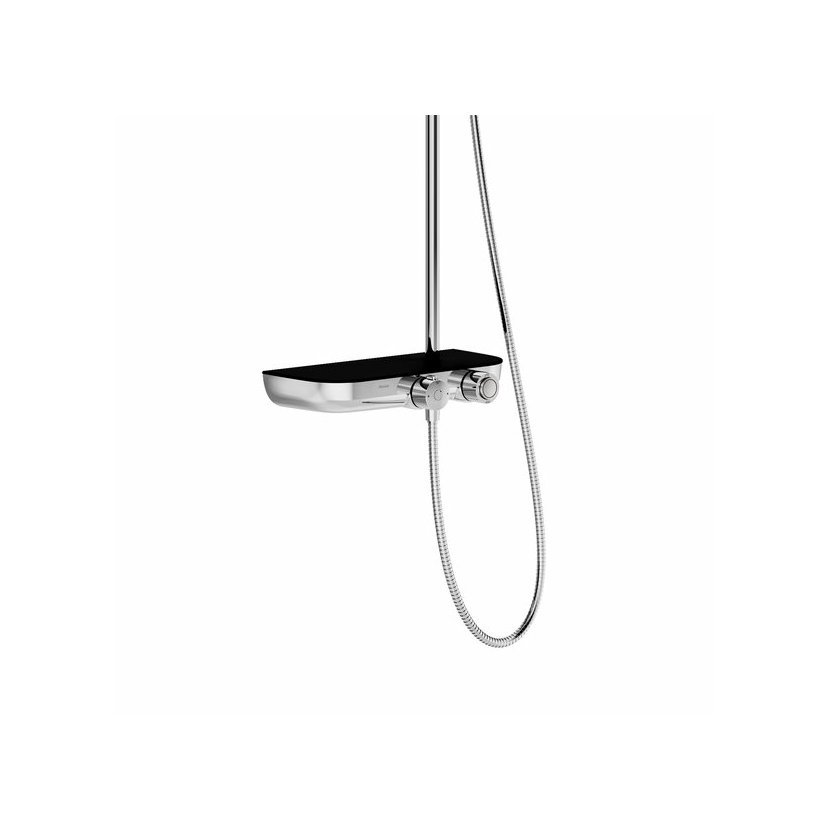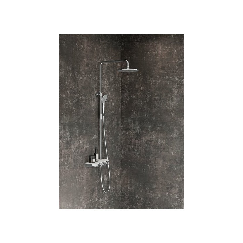 Sprchový sloup s termostatickou baterií disponuje množstvím inovativních vlastností a režimů. Otočným ovladačem s termo funkcí si nastavíte požadovanou teplotu vody. Funkcí Stop jednoduše ovládáte spínání vody pro okamžité zastavení nebo opětovné spuštění vody během sprchování. Přepínání mezi hlavovou a ruční sprchou umožňuje otočný ovladač, průtok vody se mění plynule, tzn. dochází k prolínání obou funkcí zároveň, než je dosaženo koncové polohy.